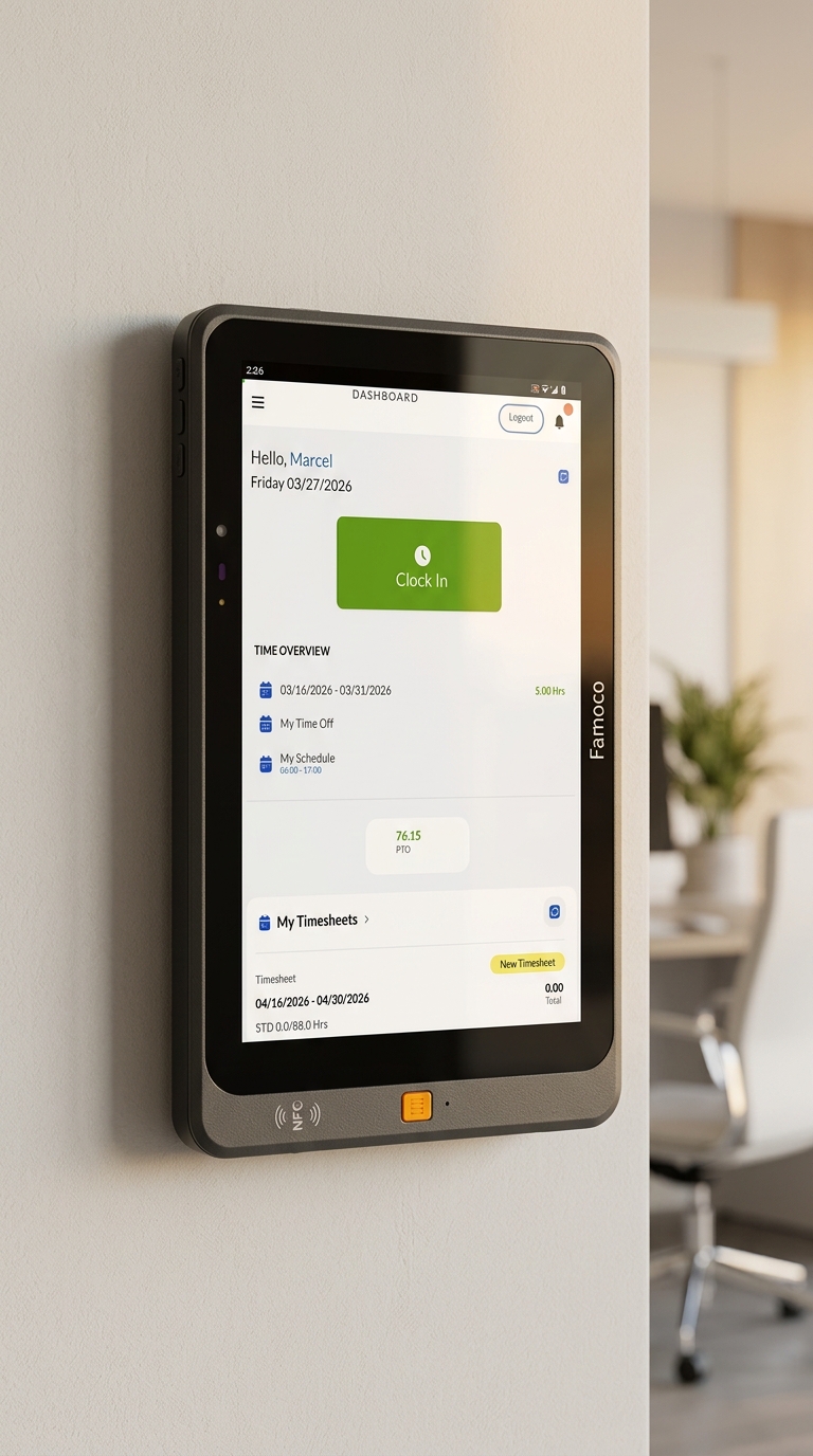 The Shared Time Clock uses a durable 10-inch tablet from Famoco, specifically engineered for tough environments. It enables a secure clock-in process by automatically capturing a photo at every login, which helps prevent "buddy punching" and makes attendance records more reliable.